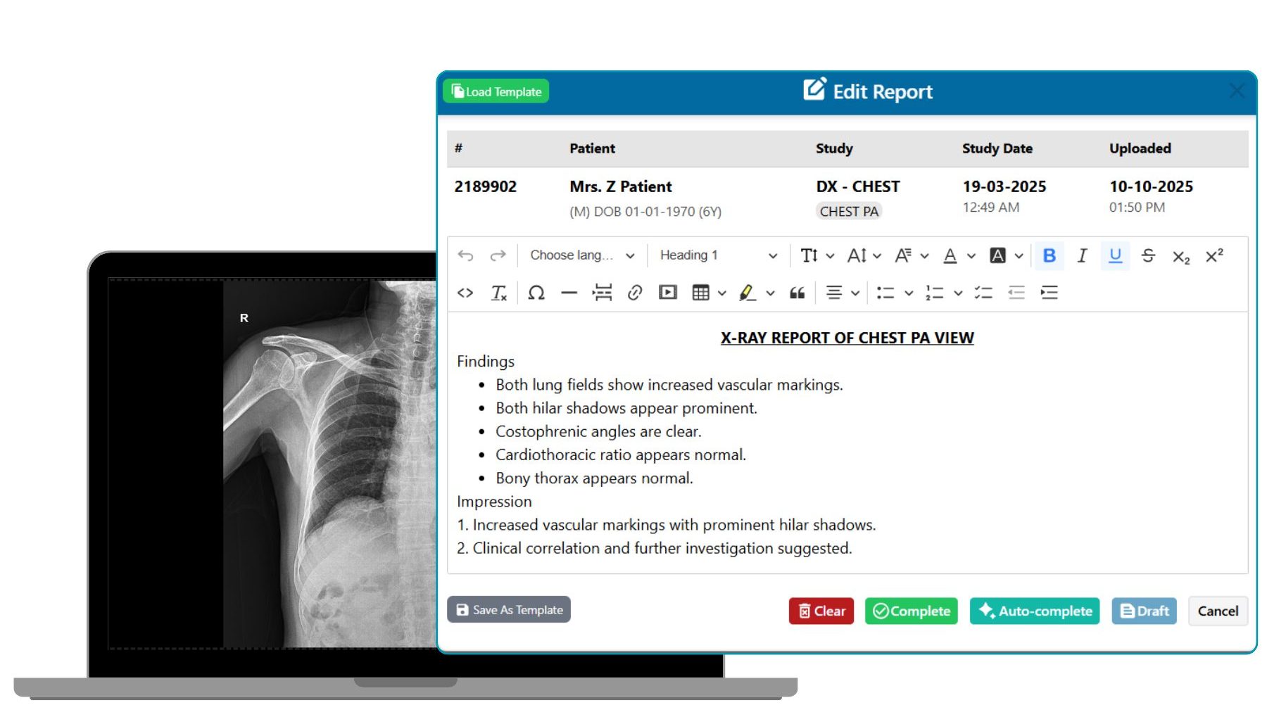 - Consistency Across Reports: Drafts are automatically created in structured formats, whether for a CT scan report, MRI report, or chest X-ray report. This standardization improves clarity and communication between departments and referring physicians.