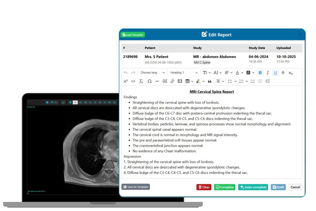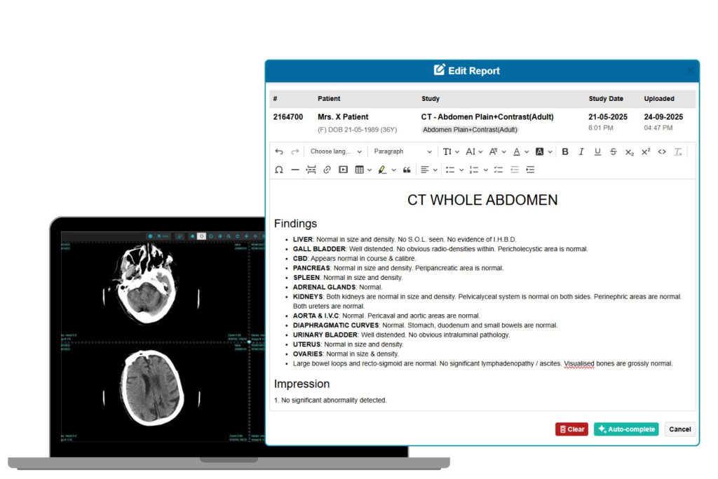 - Human Oversight Built In: AI never finalizes a report on its own. Every draft remains editable, giving radiologists full authority to refine, expand, or add critical observations. Clinical accuracy stays under expert control.