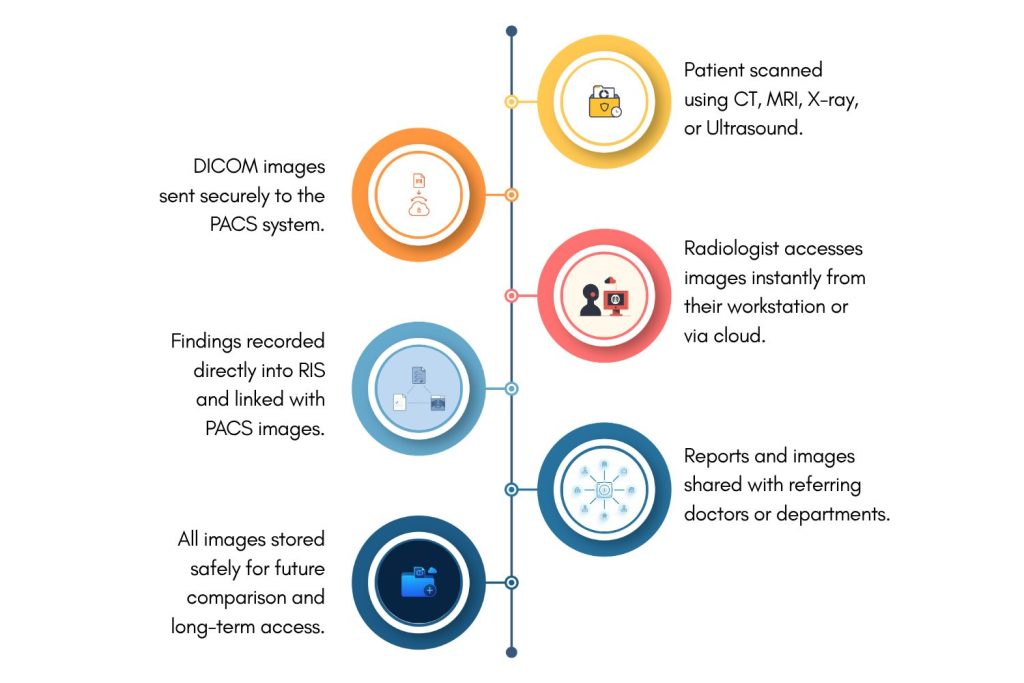 Each image is stored in a standard format called DICOM (Digital Imaging and Communications in Medicine). This allows different imaging machines and software to communicate easily. PACS also connects with other hospital systems such as RIS (Radiology Information System) and HIS (Hospital Information System), ensuring that patient records, scan results, and reports stay linked and accessible from one place.